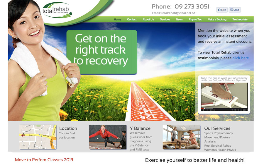 Total Rehab Physio Auckland are Physiotherapists with a unique marketable point of difference, the Y balance system which works out where you are overcompensating, a little bit like a wheel alignment machine for humans enabling more accurate diagnosis and taking the guess work out of treating patients. The brief in the project was to convey this key point of difference and present the company in an upbeat professional manner. The client regularly updates his pages via the Content management system and has indicated that they are very happy with the website.